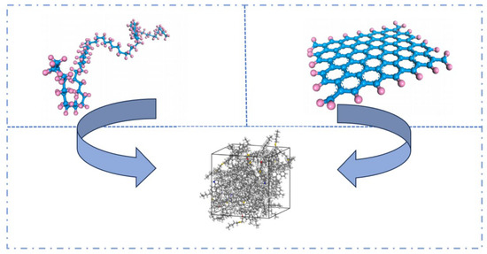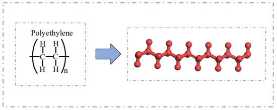 PE is a cost-effective asphalt modifier that offers an economical and efficient solution for improving pavement performance [52]. Chen Y. et al. [53] investigated the interaction mechanism of plastic-modified asphalt at the molecular level and established molecular models of PE modifiers with varying numbers of molecules to determine the optimal degree of polymerization (see Figure 15). The results indicated that the optimal degree of polymerization for PE molecules is 12. To further explore the performance of PE-modified asphalt, Li E. D. et al. [54] constructed a polyethylene molecular model based on its molecular formula. They then evaluated the compatibility between asphalt and PE by calculating the solubility parameters and interaction energies, with the established model shown in Figure 16. On the basis of PE-modified asphalt, Hu K. et al. [55] investigated the reinforcing mechanism of graphene on recycled polyethylene (RPE)-modified asphalt, and the corresponding model is illustrated in Figure 17.
