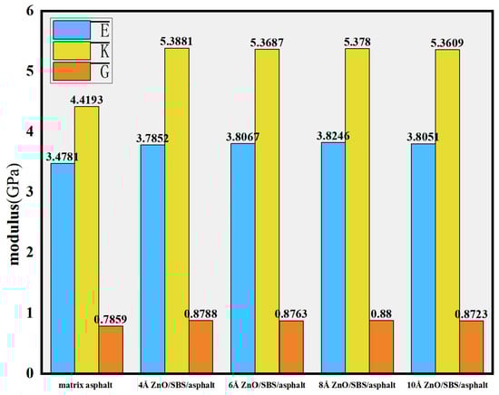 Previous studies have indicated that crumb rubber and SBS modifiers exhibit significant effects in enhancing the high-temperature performance of base asphalt and are thus being widely used to improve pavement performance [71]. Su M. et al. [9] employed molecular dynamics simulations to investigate the effects of SBS modifiers and ZnO/SBS composite modifiers with different nanoparticle sizes on the high-temperature performance of base asphalt. The mechanical properties of zinc oxide, SBS, and asphalt were analyzed within the temperature range of 383.15 K to 453.15 K, focusing on the influence of ZnO nanoparticles with diameters of 4 Å, 6 Å, 8 Å, and 10 Å. The results demonstrated that ZnO nanoparticles with a diameter of 8 Å yielded the best overall performance improvement (see Figure 21). The enhancement of the bulk modulus was most significant, indicating that the modified asphalt possesses better stability under high temperature and shear conditions.