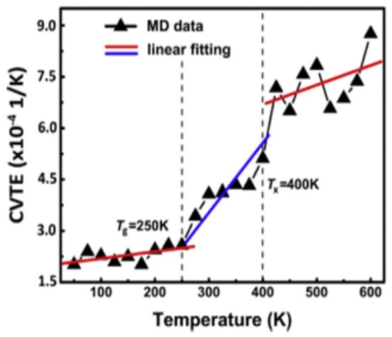 In low-temperature environments, asphalt pavements are susceptible to cracking and structural deformation caused by thermal contraction, which compromises their overall structural integrity and significantly reduces their service performance and durability [72]. To improve the performance of asphalt pavements under low-temperature conditions, high-grade base asphalts are commonly employed. In China, 70# asphalt is widely used in southern regions, while 90# asphalt is more frequently adopted in northern areas. Asphalt mixtures prepared with high-grade binders exhibit a lower low-temperature stiffness modulus, thereby reducing the risk of cracking under cold weather conditions [73]. With the advancement of molecular simulation techniques, the understanding of the molecular mechanisms governing asphalt behavior at low temperatures has deepened. The low-temperature performance of asphalt depends on its chemical composition and molecular structure. Cao et al. [74] used the glass transition temperature (Tg) to evaluate the low-temperature performance of SBS-modified asphalt and validated the corresponding experimental methods, including dynamic shear rheometer (DSR) tests, at the molecular level. Their results showed a good correlation between the physical measurements of Tg and macroscopic test results, indicating that Tg can be used to assess the low-temperature performance of SBS-modified asphalt. The AAA-1 base asphalt model exhibited a glass transition temperature around 250 K when the temperature was lowered from 400 K to 150 K, as shown in Figure 22 [75]. Using differential scanning calorimetry (DSC), Liu S. et al. [76] measured the glass transition temperatures of four asphalt samples with different penetration grades (penetration grades from 50 to 90), with the results illustrated in Figure 23. They found that base asphalts with higher average diffusion coefficients demonstrate better low-temperature performance, attributed to their increased molecular mobility. By combining molecular dynamics simulations with asphalt compositional analysis, Liu S. et al. [76] further discovered that the increase in aromatic carbon in resins and aromatic fractions promotes the dispersion of asphaltene and resin aggregates, thereby improving the low-temperature performance. Specifically, a higher aromatic carbon content reduces the aggregation of asphaltenes and resins, indicating that asphalts with a higher aromatic carbon content exhibit superior low-temperature properties. The molecular simulation results are consistent with the experimental glass transition temperature findings, demonstrating that molecular dynamics simulations can effectively predict the low-temperature performance of asphalt. Qu X. et al. [77] investigated the effects of different paraffin contents on the low-temperature stability, self-healing behavior, and mechanical modulus of asphalt. The simulations showed that paraffin significantly reduces the low-temperature stability, self-healing rate, and mechanical performance. Hu Q. et al. [68] used MD simulations to study the diffusion and thermodynamic behavior of warm mix recycled asphalt, showing that rejuvenators enhance its low-temperature performance by modifying its molecular structure and diffusion, whereas organic waxes require co-use with rejuvenators for optimal effectiveness.