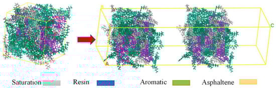 With the continuous development of the molecular dynamics in the theoretical study of asphalt diffusion mechanisms, research on the self-healing behavior of asphalt has gradually deepened. Studies have shown that factors such as the crack width, temperature, type of base asphalt, and modifier content can significantly influence the self-healing performance of asphalt. Since the healing process primarily occurs at the crack interface, the healing mechanism can be investigated by simulating the diffusion behavior of asphalt molecules across the model layers [88]. A typical self-healing molecular model is constructed with a three-layer structure, in which asphalt molecular models are placed on both sides and a vacuum layer in the middle to simulate a microcrack. The self-healing capacity is assessed by observing and analyzing how asphalt molecules diffuse in opposite directions across the vacuum interface [78]. The construction process of the self-healing model is illustrated in Figure 24.