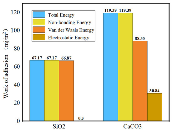 Different rocks exhibit distinct structures and characteristics. Horgnies, Darque-Ceretti, Fezai, and Felder [59] studied the mineral composition of rocks using X-ray fluorescence spectroscopy and investigated the effects of these mineral components on the tensile strength of aggregates. Their results indicated that SiO2, Al2O3, CaO, MgO, and Fe2O3 are the key mineral constituents influencing aggregate performance. In molecular simulations, aggregate models are typically represented by oxide unit cells, with common aggregate types including calcium oxide and silicon dioxide. Calcium oxide, the most common type of aggregate used in asphalt mixtures, is an alkaline aggregate with calcite as its crystalline form; therefore, calcite is often selected as the representative mineral for constructing calcium oxide aggregate models [60],while SiO2 represents acidic aggregates. By establishing unit cells for two types of silicon dioxide and calcium oxide [61,62], the adsorption process between asphalt and aggregate was simulated, revealing that the polarity effects between asphalt and aggregate are the primary cause of adhesion, as shown in Figure 18. Chen P. et al. [63] derived the crystal structure of calcite from the Cambridge Structural Database (CSD), with its unit cell structure and lattice parameters illustrated in Figure 19. To further investigate the influence of mineral types and water on the adhesion performance of the asphalt–mineral interface system, Gao et al. [64] selected four representative minerals (quartz, calcite, albite, and orthoclase) and constructed mineral–asphalt and mineral–water–asphalt interface systems, as depicted in Figure 20.