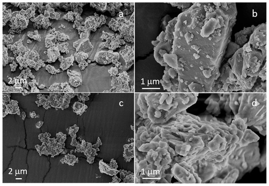 FESEM micrographs of (a,b) STe0 and (c,d) STe5.