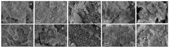 FESEM micrographs of STe0/AA SBF 0 day (a), 1 day (b), 3 days (c), 7 days (d), 14 days (e) and STe5/AA SBF 0 day (f), 1 day (g), 3 days (h), 7 days (i), 14 days (j).