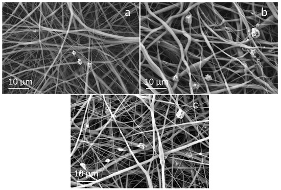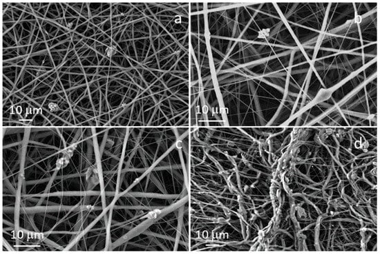 Good glass incorporation and size distribution of the fibers in the composite mats were obtained with a glass concentration of 5 wt%, 10 wt%, and 20 wt% (Figure 3a–c). In all these cases, using the ad hoc selected electrospinning parameters, glass powders were both incorporated into the fibers and dispersed in the polymeric matrix, on the surface of the fibers. In any case, 20 wt% seemed to be the most promising concentration in terms of glass incorporation.