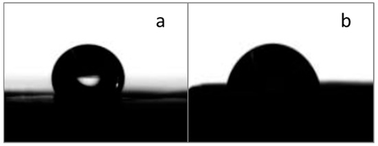 CA measurements on a pure PCL/AA fibrous mat (a) and a composite one, in detail, a fibrous mat of PCL/AA/STe0(5%) (b).