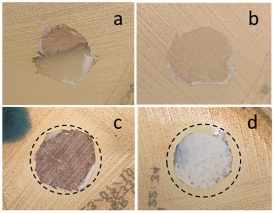 Inhibition halo test of (a) PCL/AA, (b) PCL/AA/STe5(5%), (c) PCL/AA/STe5(10%) and (d) PCL/AA/STe5(20%) fibers.