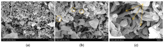 The SEM micrographs show that the CSF structure resembles a mesh of interwoven fibres (Figure 1c), which is attributed to the plant-based origin of the material. The images also reveal the presence of amorphous silica inclusions (Figure 1b) and inorganic compounds in the form of agglomerates composed of layered structures.