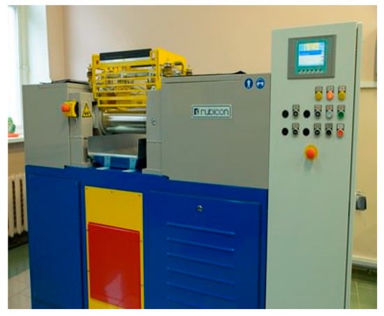 The elastomeric compounds were prepared using a three-stage mixing process on laboratory two-roll mills RC-WW 330 150/150 (Rubicon, Halle, Germany) (Figure 3). At the first stage, styrene–butadiene rubber was mixed with silica/CSF, silane, dispersant, plasticiser, zinc salt of fatty acids, resin, zinc oxide, and masterbatch. The discharge temperature from the mixer was 145–150 °C.