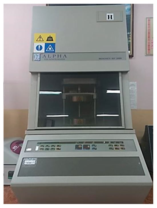 Mooney viscosity was determined using a disc-type rotational viscometer MV 2000 (Alpha Technologies, Hudson, OH, USA) according to standard methodology (Figure 4) [49]. In this method, the polymer sample is subjected to circular shear at a constant rate in a thin annular layer. The torque generated in the sample is proportional to the polymer’s viscosity.