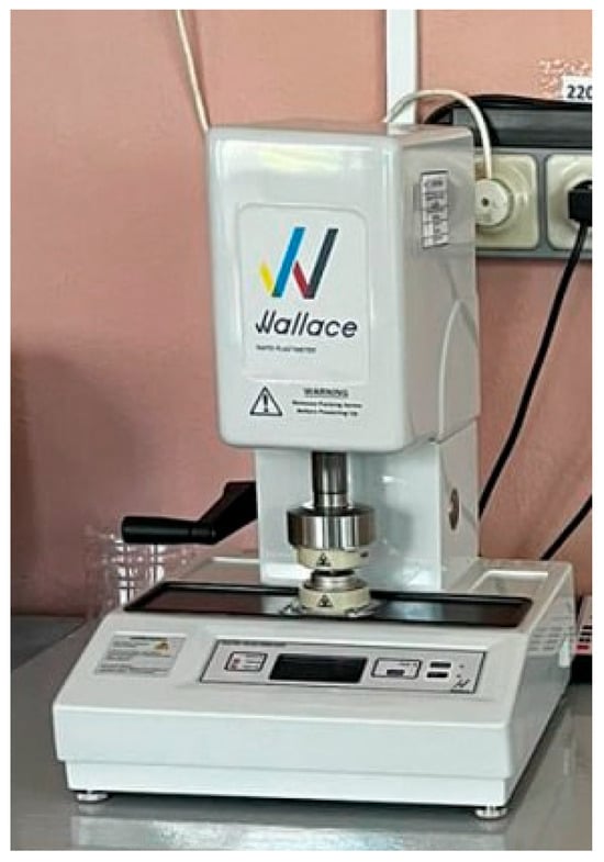According to standard methodology [50], the plasticity (P) of the rubber compounds was determined using a Wallace plastometer, model P.12E (Wallace, Surrey, UK) (Figure 5), with a rigid system mass of 5.00 ± 0.01 kg and a testing temperature of 70 ± 1 °C. This parameter is defined as the ratio of residual deformation to the average sample height under load and is calculated using Equation (1).