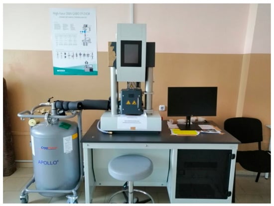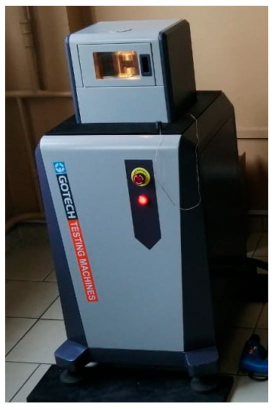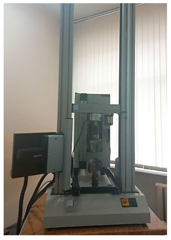 The elastic and strength characteristics of the elastomeric compositions were assessed based on tensile strength, stress at a specified elongation, and elongation at break, using a T2020 DC10 SH tensile testing machine (Alpha Technologies, Hudson, OH, USA) (Figure 7) according to standard methodology [52].