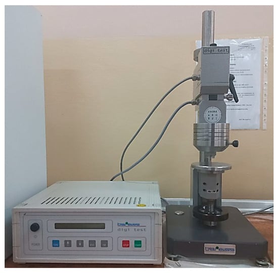 Shore A hardness of the elastomeric compositions was determined before and after thermal ageing (100 ± 2 °C for 12 ± 0.25 h) using a DIGI-TEST durometer (Bareiss, Oberdischingen Germany) (Figure 8) on three specimens, following standard methodology [54].