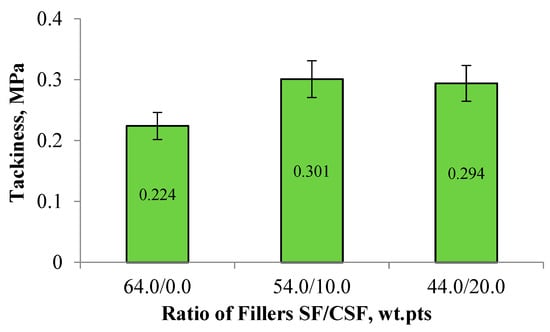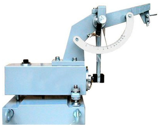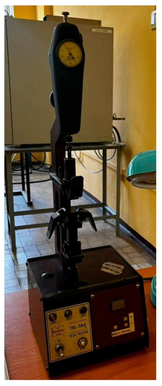 Tackiness of the rubber compounds was assessed by measuring the conditional stress required to separate two identical rubber specimens after a 30 s contact under a 16-ounce load at a deformation speed of 25.44 mm/min. Testing was conducted using a Tel-Tak device (Monsanto, St. Louis, MI, USA) (Figure 10).
