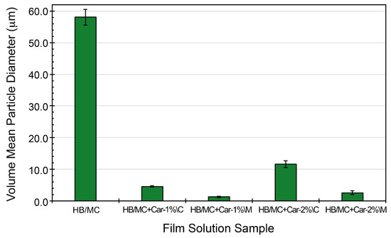 The particle size (μm) distribution of the film-casting solutions, as volume (D4, 3), and surface area mean (D3, 2) values, was measured using a Laser Scattering Particle Size Analyzer (Partica LA-950 V2, Horiba Instruments, Inc., Irvine, CA, USA). The solution was diluted with deionized water to achieve proper dispersion before adding it to the analyzer chamber. The volume mean size (μm) (D4, 3) was used for final analysis. Measurements were conducted three times to ensure accuracy, and the average particle size values were recorded [15,37,38].