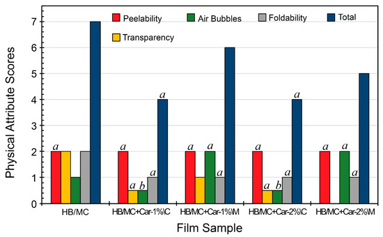 Physical attribute scores of the HB/MC-based film samples. Data sharing the same letter are not statistically significantly different (p > 0.05). Data with no letters are significantly different statistically from other points within the same group. Abbreviations: Hemicellulose B (HB), methylcellulose (MC), carvacrol (Car), coarse emulsion (C), micro-emulsion (M).