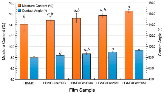 Moisture content (%) and contact angle (o) of the HB/MC-based film samples. Data are mean ± standard deviation (n = 3). Data sharing the same letter are not statistically significantly different (p > 0.05). Data with no letters are statistically significantly different from other points within the same group.