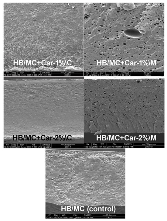 Incorporating carvacrol altered the film’s color characteristics. The C-films exhibited reduced lightness and increased yellowness compared to the control. For example, HB/MC+Car-1%\C showed L = 84.72 and b = 16.24, while HB/MC+Car-2%\C demonstrated even lower lightness (L = 83.98) and higher yellowness (b = 17.14). On the other hand, the M-films exhibited comparable lightness and higher yellowness. Specifically, HB/MC+Car-1%\M retained L = 85.76 and b = 15.84, while HB/MC+Car-2%\M exhibited L = 85.60 and b = 16.28.