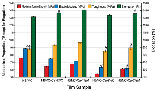 Mechanical properties for the HB/MC-based film samples. Data are mean ± standard deviation (n = 3). Data sharing the same letter are not statistically significantly different (p > 0.05). Data with no letters are statistically significantly different from other points within the same group.