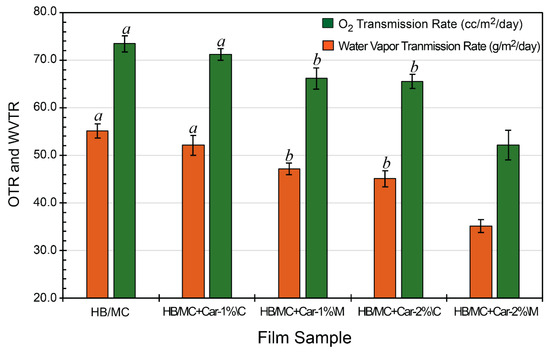 Oxygen (OTR) and water vapor transmission rate (WVTR) of the HB/MC-based film samples (w/wo carvacrol). Data are mean ± standard deviation (n = 3). Data sharing the same letter are not statistically significantly different (p > 0.05). Data with no letters are statistically significantly different from other points within the same group.