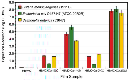 Similar results were obtained for E. coli, where the M-films with 1% and 2% carvacrol (HB/MC+Car-1%\M and HB/MC+Car-2%\M) arrived at 5.61 and 8.09 Log CFU/mL reductions, respectively, compared to much lower reductions of 0.58 and 0.51 Log CFU/mL for their C-films counterparts (HB/MC+Car-1%\C and HB/MC+Car-2%\C) (Figure 7). For Salmonella, the M-films demonstrated superior antimicrobial performance, reaching reductions of 3.75 and 7.56 Log CFU/mL for 1% and 2% carvacrol concentrations (HB/MC+Car-1%\M and HB/MC+Car-2%\M, respectively). On the other hand, the C-films with the same concentrations exhibited reductions of only 1.56 and 1.88 Log CFU/mL.