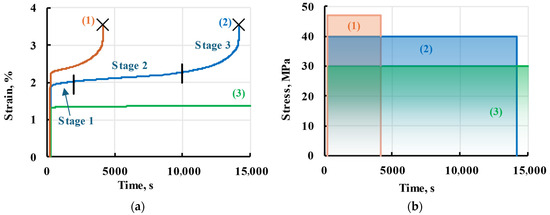 General scheme of a material creep (a) under high (1), moderate (2), and low-stress levels (3) and applied stress (b). Three creep stages are given for creep at a moderate stress level. Crosses (×) represent samples breaking.