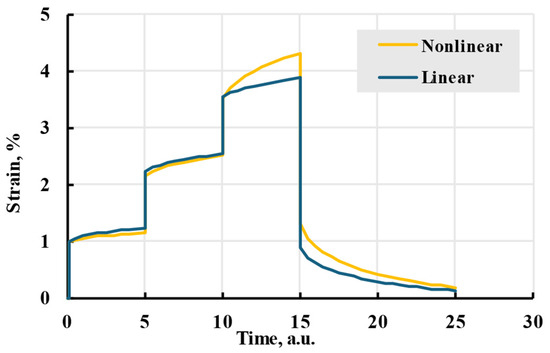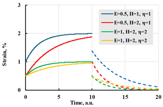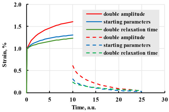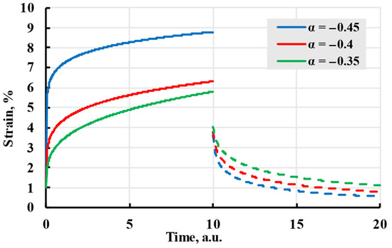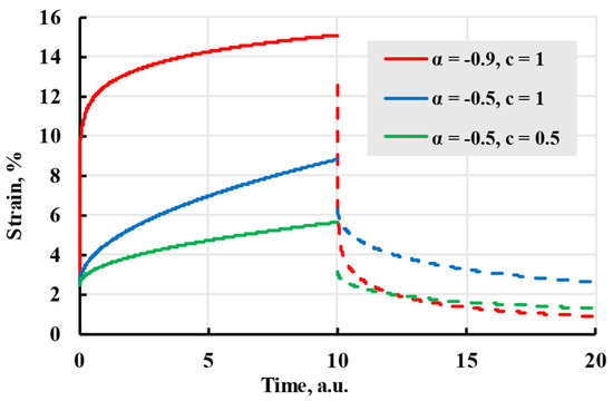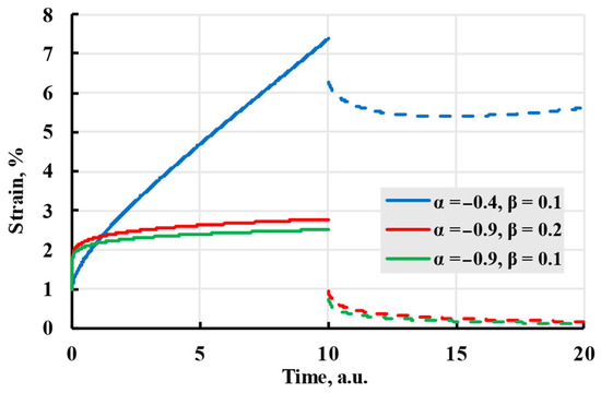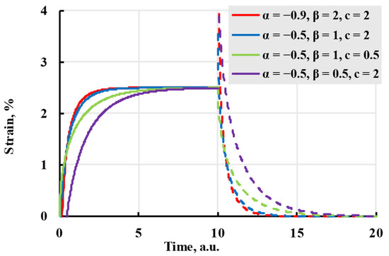 Although it described the viscoelastic creep better, it has difficulty modelling creep recovery from viscoelastic deformation and is more complex to calculate. The difficulties of the model can be seen in Figure 8, where chosen parameters, although they follow the general form of viscoelastic creep, do not give a result substantially different from the elastic model, as well as the curve using parameters α = −0.5, β = 0.5, c = 2, has a strain starting at negative values and recovery starting higher than the end of creep.