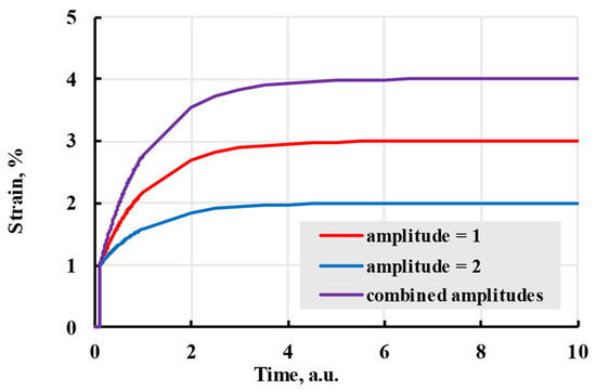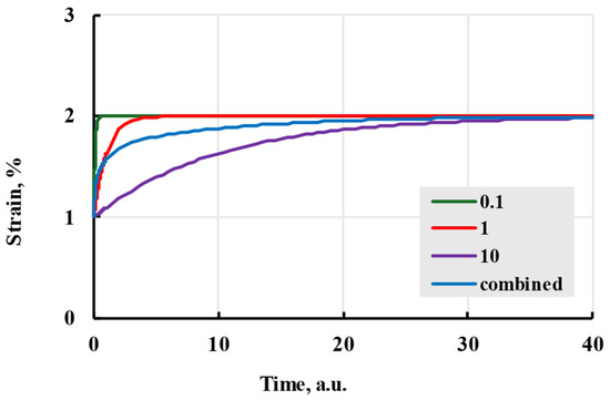 Different relaxation times indirectly represent the thermodynamic movement of different molecular chain parts. Larger relaxation times relate to slower polymer conformation changes and slower deformation speed. If all amplitudes of terms are the same, all terms will reach the same deformation in time. The difference in speed can be minimal, even when doubling the relaxation time (Figure 5). To limit possible options, relaxation times are usually chosen as powers of 10 or evenly spaced through the experiment time [33]. The advantages of using the Prony series kernel can be seen when observing the curves given by each term separately and their combination with total additional deformation equal to amplitudes of separate terms. Figure 6 shows that combination gives a deformation speed higher than the term with the biggest relaxation time but lower than the smallest.