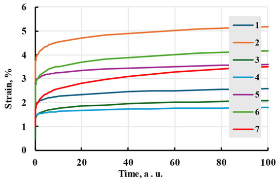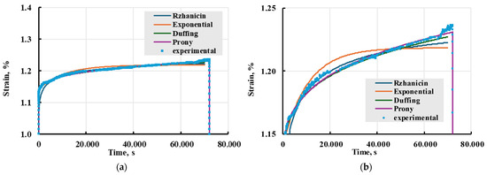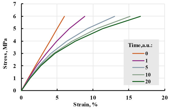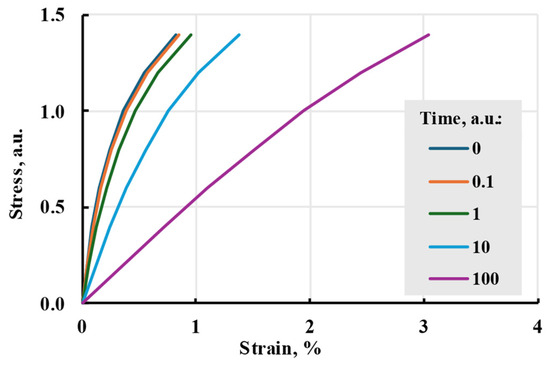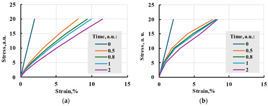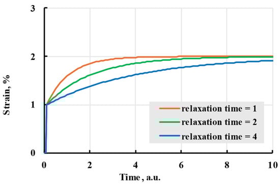 where and are constants. As seen in Figure 2, constant changes the steepness of curves at the beginning of the creep, while constant determines the strain rate at a longer elapsed time. Integrating Boltzmann–Volterra Equation (4) with momentary stress results in a deformation equation: