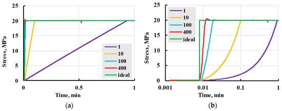 Some real-life problems may occur during testing, one of the most prominent being non-instantaneously applied stress during sample loading, as seen in Figure 11. For example, samples of 20 MPa stress loading at different speeds were observed on a ZWICK 2.5 testing machine (ZwickRoell GmbH & Co. KG, Ulm, Germany). At a high loading rate, a testing machine overshoots the target stress level, causing problems in determining elastic strain and the beginning stage of creep [38]. This overshoot is seen for a loading rate of 400 mm/min (red line); it is less pronounced for a loading rate of 100 mm/min (blue line) compared with ideal stepwise loading (green line). The loading stage in Figure 11 intentionally started at time t0 = 0.008 min and shifted from the zero point to be clearly visible in semi-logarithmic coordinates.