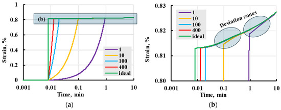 The deformation that appears during the loading stage in explicit form is expressed by (20) and inexplicitly included in (21). The linear loading model was compared with stress loading as the Heaviside function (instantaneous loading). For the relaxation spectrum with the lowest relaxation time of 0.1 min, deformation curves seen in Figure 12 were calculated. The differences in deformation at the creep stage when the loading step is finished can be observed for different loading speeds. For high loading speeds of 400 and 100 mm/min, the deformation is indistinguishable from the instantaneous ideal loading. The red and blue lines coincide with the green line for the creep stage. For low loading speeds of 10 and 1 mm/min, the deviation is noticeable. Still, the lines converge with the deformation of instantaneous loading within a period of the next nearest power of ten, i.e., 1 min for 10 mm/min and 10 min for 1 mm/min (the deviation zones are shown).
