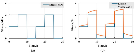 where stress is in MPa. The loading starts at t = 0 h in a given case. For an example loading programme (24), Equation (23) will result in a calculated viscoelastic strain seen in Figure 13b, where elastic strain is also given for comparison.