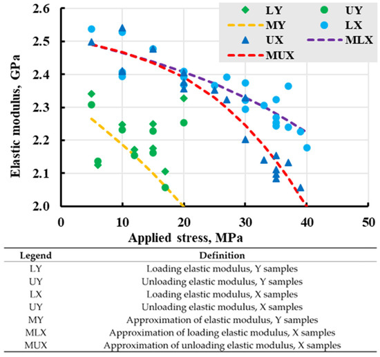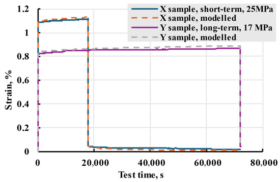 For the Prony series kernel with given loading times, it was determined that creep during loading stage can be neglected and all deformation during stress loading can be described with elastic response. The response itself changes with applied stress, its values being close for low and moderate stresses, but noticeably different for high stresses. This difference suggests accumulation of plastic deformations and material hardening, particularly after creep strain reaches 0.1% for X samples and 0.05% for Y samples.