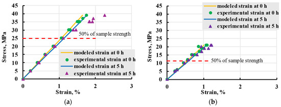 Creep isochrones of viscoelastic experiments for X (a) and Y (b) samples at t = 0 (elastic strain, green dots, yellow lines) and 5 h (blue triangles, blue lines).