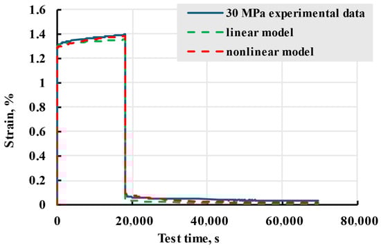 Experimental data of X sample creep experiment at stress of 30 MPa and modelled linear and nonlinear curves.