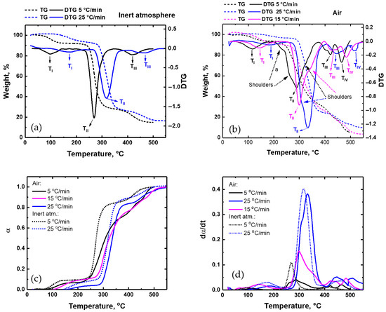 Thermogravimetric analysis was conducted on pure PVA films in air and inert atmospheres at different heating rates: 5, 15, and 25 °C/min. Figure 1a,b show the thermogravimetric curves (mass loss versus temperature, TGA) and their DTG curves for the PVA films in different atmospheres. Each peak of the DTG curves represents a separate event and corresponds to the temperature of the maximum rate of mass loss (TGA curve) [9]. The different DTG peaks have been labeled in Figure 1 with a capital T, with subscripts in capital Roman numerals. The calculated conversion (α) and conversion rate (dα/dt) corresponding to the TGA data are displayed in Figure 1c,d, respectively.