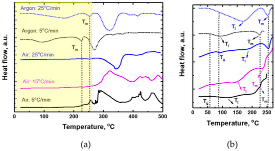 In Figure 1b, the DTG curves in air show several shoulders (see arrows in Figure 1b), which can be caused by different overlapping processes during degradation. At the lowest heating rate (5 °C/min), at 210–230 °C, there is a shoulder, labelled “a” in the Figure, which lies within the melting range and also coincides with the onset of the exothermic event in the DTA curve (solid black line, Figure 2b). Thomas et al. [14] observed similar shoulders in both air and inert atmospheres at 1 °C/min, concluding that they result either from inhibition of degradation due to the melting of crystallites or from a shift in the degradation mechanism. Degradation is initiated in the amorphous regions and does not extend to the crystalline regions before melting. In our case, under an inert atmosphere, this shoulder is barely noticeable, and we cannot rule out the possibility that it emerges as a result of oxidation processes in air.