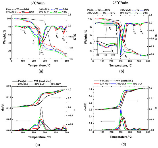 TGA and DTG curves for PVA and PVA/glycerol films measured at 5 °C/min (a) and 25 °C/min (b) heating rates in air. Calculated conversion and reaction rate at 5 °C/min (c) and 25 °C/min (d) heating rates for corresponding TGA data in (a,b) and PVA film in an inert atmosphere. In (c,d) the arrows indicate the corresponding y-axis for each set of curves.