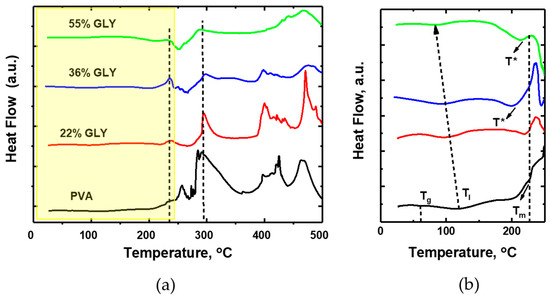 In Figure 4b, the melting point Tm of the pure PVA sample (black curve) is also noticeable as an endothermic minimum, highlighted by an arrow. The film with 22% w/w glycerol also contains PVA crystalline domains. A slight displacement of the melting point Tm to a lower temperature in this case might be explained by the presence of glycerol at the PVA crystalline domain interface.