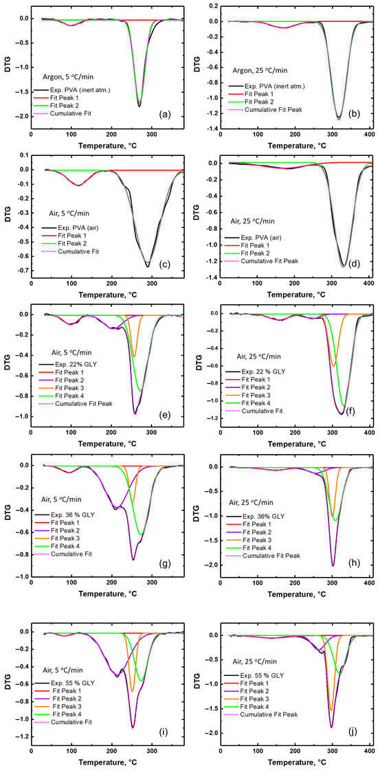 To analyze the possibility of overlapping processes in thermal decomposition, deconvolution of DTG curves was performed. Different functions can be used for deconvolution analysis: symmetric functions such as the Gaussian and Lorentz functions, and the asymmetric Weibull or Fraser–Suzuki functions [25,26]. While the asymmetric functions are considered to be more suitable for deconvolution procedures in TGA [26], the symmetric functions might provide a reasonable approximation and can be used for preliminary or qualitative analysis. In our case, Gaussian fitting was used, considering the minimum number of component peaks corresponding to the characteristic degradation peaks. Additional peaks were introduced only when the fitting was unsuccessful. The high correlation coefficients (R2 > 0.95) between experimental data and the multi-peak fitting confirm the reliability of the deconvolution. Figure 5 shows the results of DTG peak deconvolution for pure PVA films in an inert atmosphere (Figure 5a,b) and in air (Figure 5c,d), as well as for PVA/glycerol films in air at two heating rates (5 °C/min and 25 °C/min; Figure 5e–j). For pure PVA films, the curves are well described by the fitting procedure. However, the asymmetric shape of some peaks suggests that alternative asymmetric functions, such as the Fraser–Suzuki and Weibull functions [26], might improve accuracy in future analyses. Although the main degradation peak for PVA in air has been described by a single Gaussian peak, the slight indication of shoulders in the peak shape and its broader nature compared to that in an inert atmosphere likely reflect contributions of different mechanisms (see the aforementioned discussion in relation to Figure 1, just before the introduction of Table 1). Nevertheless, additional component peaks were not introduced, so as to avoid unnecessary complexity in the fitting.