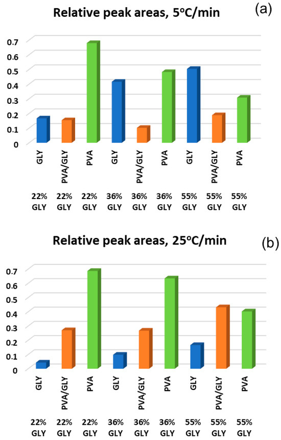 Figure 6 shows the relative peak areas of the deconvoluted peaks presented in Figure 5. The area under each peak was divided by the total area of the three deconvoluted peaks (peaks 2–4). The three deconvoluted peaks correspond to thermal events associated with glycerol decomposition (peak 2 of Figure 5e–j), PVA/glycerol complex degradation (peak 3 of Figure 5e–j), and PVA degradation (peak 4 of Figure 5e–j). At a 5 °C/min heating rate, at lower glycerol content (22% w/w), the relative contribution of PVA degradation is dominant, with low influence from glycerol or PVA/glycerol complexes. This is consistent with the manner in which glycerol incorporates to the PVA matrix, according to the results reported in [8] (see related discussion above in the context of Figure 4).