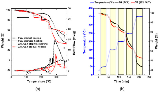 Figure 7 summarizes the main findings of this study. Figure 7a shows a comparison of the weight loss and heat flow as functions of temperature for pure PVA and PVA/22% glycerol, obtained using two heating modes: stepwise isothermal heating and gradual heating. Figure 7b shows the weight loss for the same samples as a function of time, with isothermal plateaus highlighted in yellow.