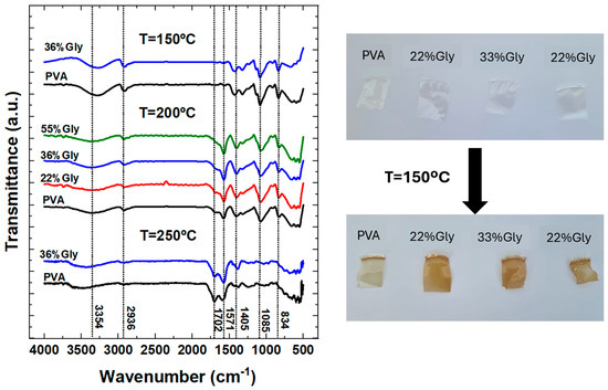 FT-IR of PVA and PVA/Gly after isothermal treatment at 150 °C, 200 °C, and 250 °C for 30 min. Photos: untreated films (upper row) and films after treatment at 150 °C (lower row).