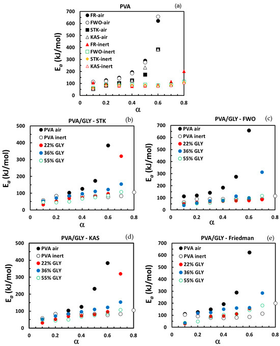 The apparent activation energy as a function of conversion for the thermal decomposition of PVA film in air and in an inert atmosphere (a). The apparent activation energy as a function of conversion for the thermal decomposition of PVA and PVA/glycerol films in air and PVA films in an inert atmosphere, calculated with different methods: (b) Starink, (c) Flynn–Wall–Ozawa, (d) Friedman, and (e) Kissinger–Akahira–Sunose.