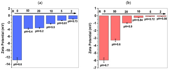 Zeta potential of PVP (0.1 wt%) solutions before irradiation: (a) PVP 1300 kDa and (b) 360 kDa for R from 50 to 2.