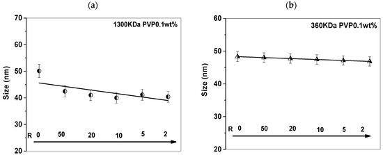 Size change in PVP (0.1 wt%) solutions before irradiation: (a) PVP 1300 kDa and (b) 360 kDa for R from 50 to 2.
