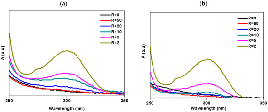 UV spectra of PVP-Gd complex in aqueous solutions prior to irradiation, where [PVP] is 0.1 wt%: (a) PVP 1300 kDa and (b) 360 kDa for R from 50 to 2.