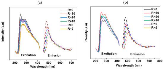Fluorescence spectra of PVP-Gd complex aqueous solutions before irradiation, where [PVP] is 0.1 wt%: (a) PVP 1300 kDa and (b) 360 kDa for R from 50 to 2.