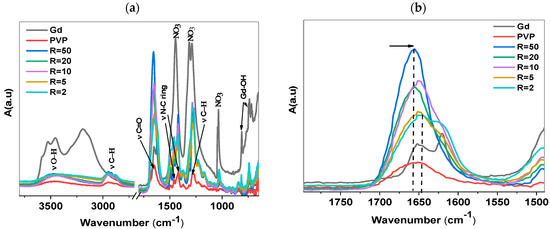 The aqueous solutions of PVP and PVP/Gd were lyophilized to produce a powder for additional characterization. The ATR-FTIR spectra of PVP-Gd, taken as a powder at various R values, are presented in Figure 5.