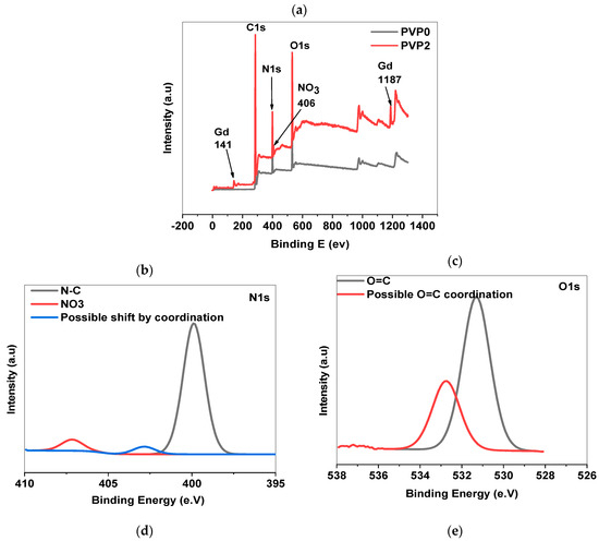 The presence of Gd in the PVP-Gd (R = 2) samples was conclusively confirmed through XPS analysis by detecting characteristic binding energy peaks at 141 eV and 1187 eV, as shown in Figure 6a. These binding energies correspond to the Gd 4d5/2 and Gd 3d5/2 core levels, a well-known signature of gadolinium in its oxidized state [31].
