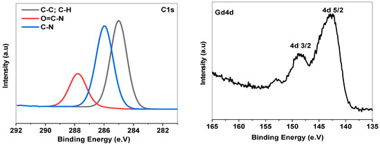 As illustrated in Figure 6e, the spectrum for Gd distinctly shows the characteristic peaks corresponding to the Gd 4d core levels. Specifically, two prominent peaks are observed at 142 eV and 148.5 eV, which are attributed to the Gd 4d5/2 and Gd 4d3/2 orbitals, respectively. These peaks indicate the Gd3+ oxidation state, confirming the presence of gadolinium ions in their trivalent form within the PVP-Gd (R = 2) sample. The Gd 4d5/2 peak at 142 eV and the Gd 4d3/2 peak at 148.5 eV are well-established signatures of Gd3+ ions and demonstrate the successful incorporation of Gd into the PVP matrix. The appearance of these peaks not only validates the presence of Gd but also ensures that the gadolinium ions are in the expected oxidation state, which is crucial for their intended applications, in imaging materials. Overall, the clear observation of these Gd 4d peaks confirms that Gd has been successfully loaded into the PVP matrix, as intended when preparing the PVP-Gd (R = 2) sample [32,33].